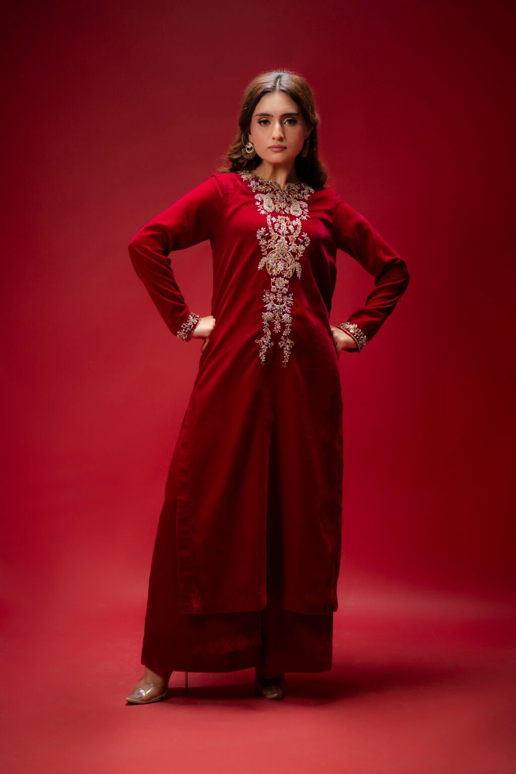 Roman exuding refined elegance and timeless charm, this deep red ensemble is crafted for moments that call for understated luxury. The long shirt features intricate hand embellishment along the neckline and front, adorned with delicate dabka, tilla, and subtle sequin work that adds a soft, luminous finish.